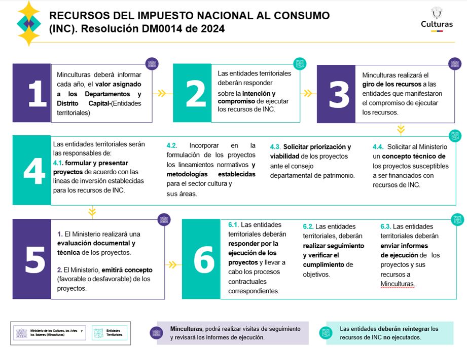 Los recursos del INC se ejecutan a través de entidades territoriales del orden Departamental y el Distrito Capital de acuerdo con los lineamientos estructurados por el Ministerio de las Culturas, las Artes y los Saberes.
