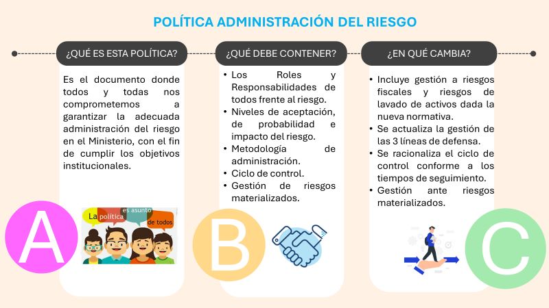 Actualmente el Ministerio de las Culturas, las Artes y los Saberes se encuentra actualizando su Política para la administración del riesgo DI-OPL-006, este es un ejercicio participativo que requiere de los aportes por parte de la ciudadanía y grupos de valor, desde la Oficina Asesora de Planeación hacemos una especial invitación para que todos aportemos a la consolidación de este importante documento.