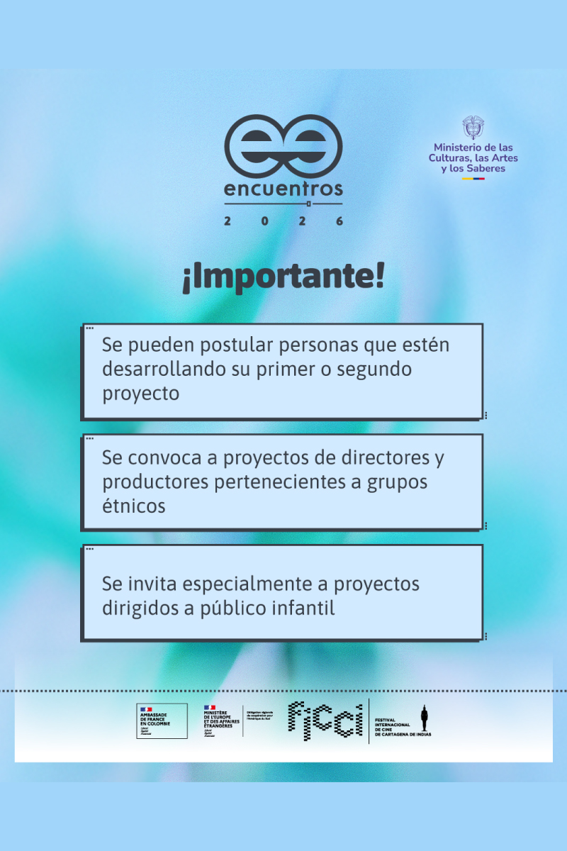 Para el Encuentro Nacional de Productores - Animación se convoca especialmente a proyectos dirigidos a público infantil, asegurando mínimo cuatro (4) cupos para su participación, siempre y cuando cumplan con el puntaje requerido en la evaluación de la convocatoria.