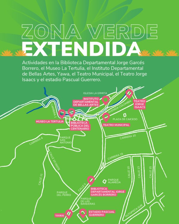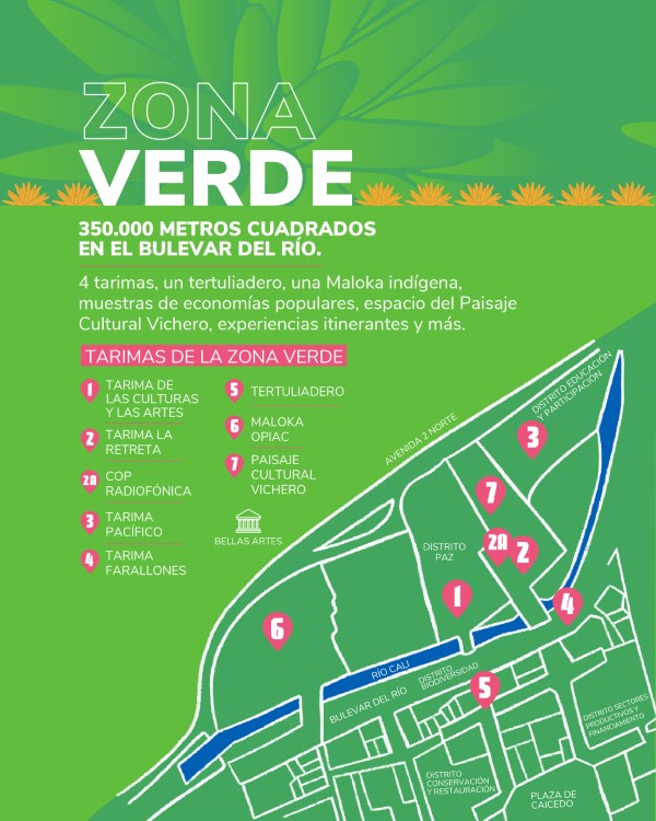 Descubre la Zona Verde, ubicada en el Bulevar del Río, y súmate a las dos Rutas Bioculturales: una pasa por Ladera, Siloé y puntos de resistencia y la otra se desarrollará por las 5 comunas del oriente de Cali.