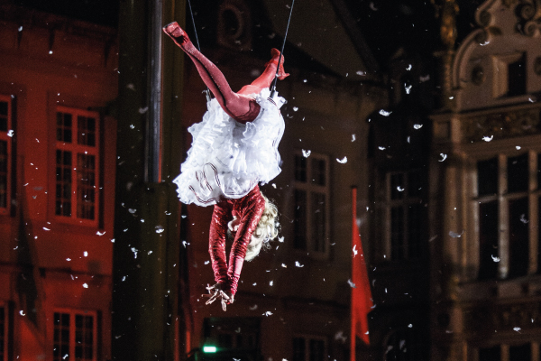 Los ciclistas, violinistas, actrices y acróbatas se elevan junto a esa inmensa estructura circular en la que, además, se proyectan imágenes oníricas. Para la artista belga, una de las características más importantes de la obra es que se pueda entender sin palabras, lo que explica la cantidad de países en los que se ha presentado.