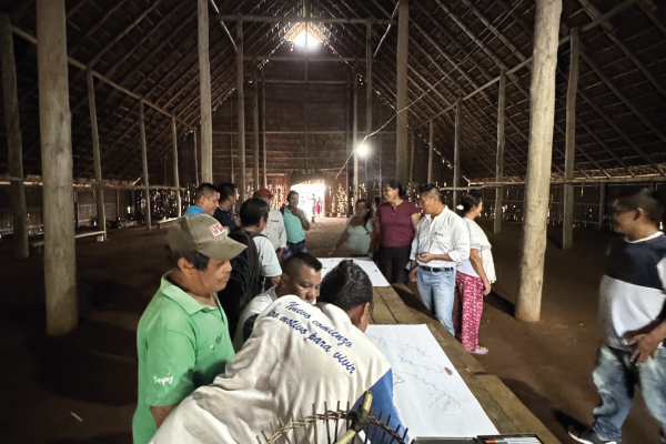 Imagen del trabajo con la comunidad para realizar el diseño de una casa biocultural en Vaupés. Foto: Grupo de Infraestructura Cultural del Minculturas.