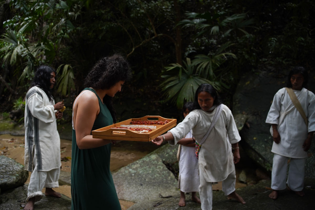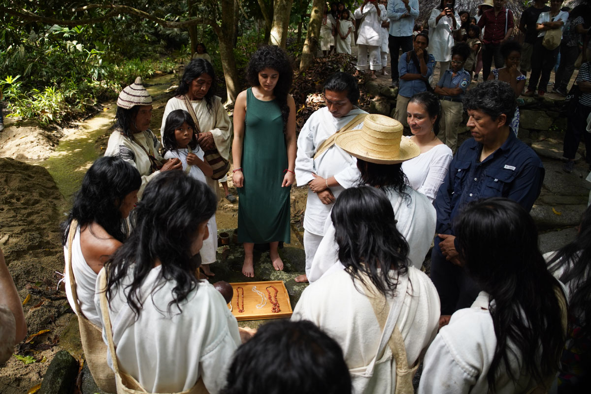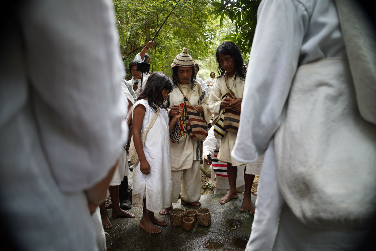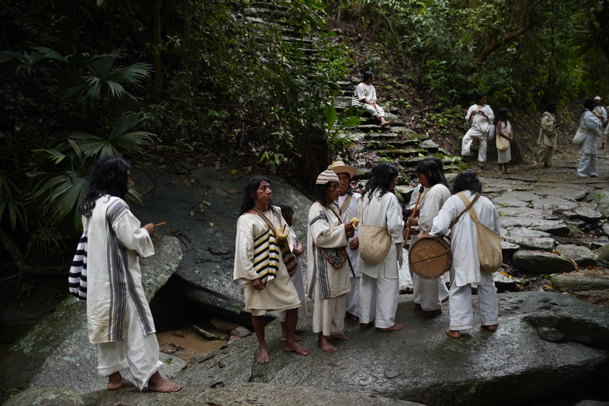 Luego de desempacar las piezas, todos se dirigieron a una gran piedra sobre el río. Allí pusieron las piezas. Alrededor estaban las personas que hicieron parte de este pacto de paz con la naturaleza, en un círculo que rodeaba los objetos/espíritus. Algunos con mochilas y tutusomas (sombreros koguis tejidos a mano), otros haciendo sonar las flautas koguis, varios bailando, unos más con maracas, todos descalzos.