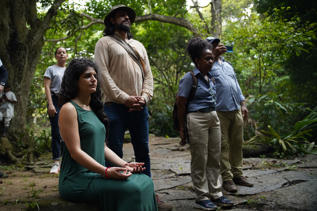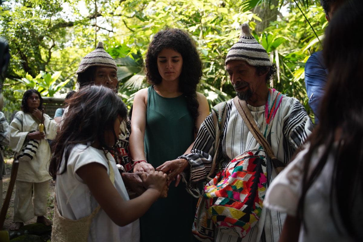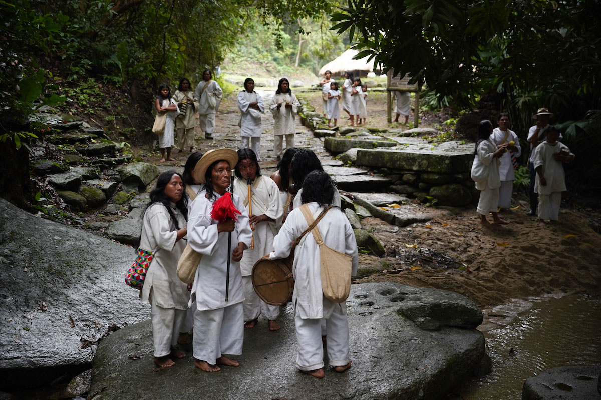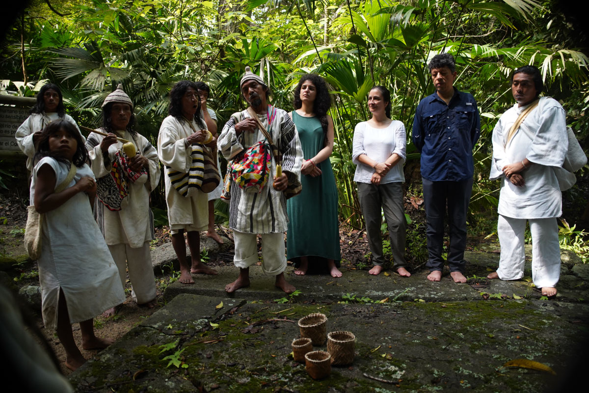 Luego de desempacar las piezas, todos se dirigieron a una gran piedra sobre el río. Allí pusieron las piezas. Alrededor estaban las personas que hicieron parte de este pacto de paz con la naturaleza, en un círculo que rodeaba los objetos/espíritus. Algunos con mochilas y tutusomas (sombreros koguis tejidos a mano), otros haciendo sonar las flautas koguis, varios bailando, unos más con maracas, todos descalzos.