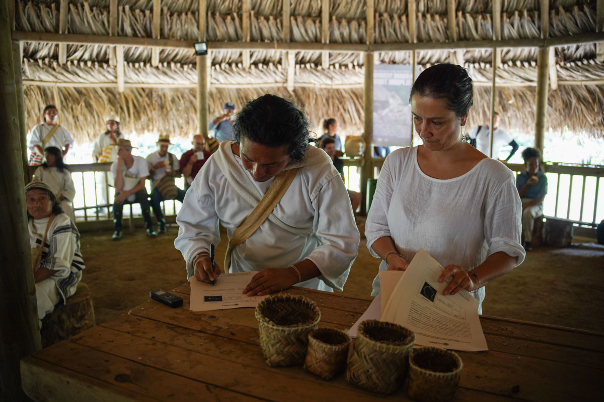 Luego de escucharlo seguimos caminando, cuesta arriba, hasta llegar a una especie de kiosco. Nos reunimos en torno al fuego, que ardía en algunos troncos gruesos en la mitad del lugar, y nos sentamos en unas bancas de madera. Allí asistimos a la entrega formal: la firma del acuerdo con los compromisos y la intervención de la autoridad kogui, de la ministra y de los delegados del Icanh. La humedad del aire se disipó y un rayo de sol se asomó entre las nubes blancas.
