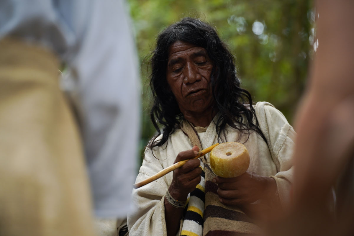 Entramos unos metros más, hasta un riachuelo. Los vestidos blancos de un grupo de hombres indígenas resaltaban en el verde espeso de la sierra. Llevaban en sus manos un poporo, un calabazo seco con un pequeño orificio en cuyo interior suelen mezclar el polvo de conchas de mar con el ayu (hojas de coca). La madera amarilla del poporo hacía juego con el amarillo del agua. Y las manos de los hombres iban y venían alrededor del poporo, que frotaban de manera constante y en círculos.