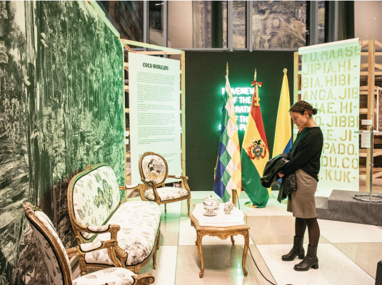 La exposición, organizada por el colectivo colombiano Liana Collective en colaboración con la Misión Permanente de Colombia ante la ONU, el Ministerio de las Artes, las Culturas y los Saberes y Open Society Foundations, se desarrolla en el marco de las conversaciones sobre derechos indígenas y la reclasificación de la hoja de coca en la legislación internacional.