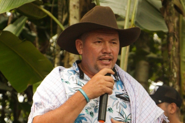 Este hombre de 42 años (próximo a cumplir los 43 en agosto), contextura gruesa, cabello claro (mono John, le dicen en su comunidad), piel blanca y una barba que mantiene a ras, habla poco, aunque cuando lo hace suele ser certero y directo. Eso no significa que no use el humor —puede terminar su intervención con un chiste— o que no sonría de vez en cuando, aunque su apariencia sea la de un hombre muy serio. Eso sí, prefiere, muchas veces, estar en segundo plano, escuchar y solo habla si la situación lo amerita. Así lo hizo, por ejemplo, durante la cumbre de líderes sociales en Bogotá (la V Cumbre Humanitaria) en la que se realizó esta entrevista.
