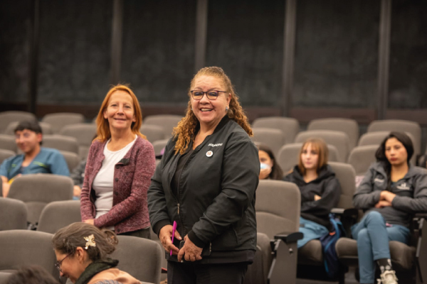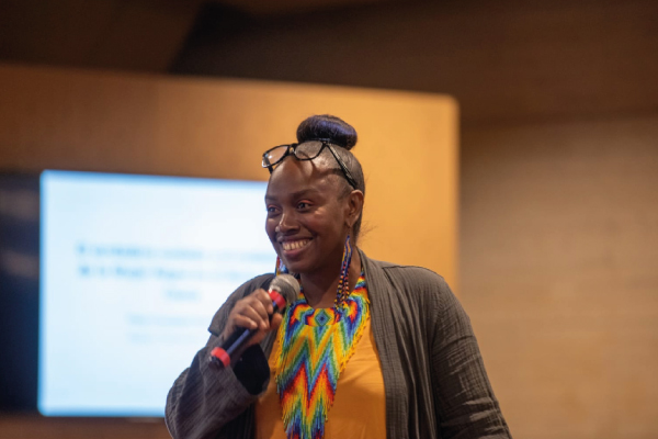 Yisel Carabalí es también cantante, escritora y líder comunitaria del norte del departamento del Cauca. Antes de su intervención, invitó a todo el público del auditorio a levantarse de sus asientos y crear vínculos a través de juegos y danzas. Foto: Erick Morales