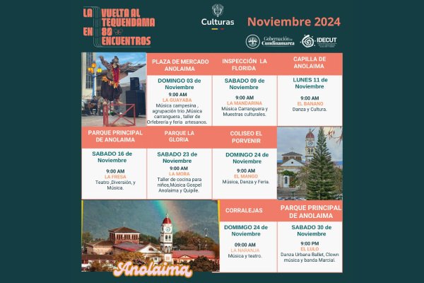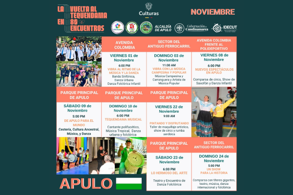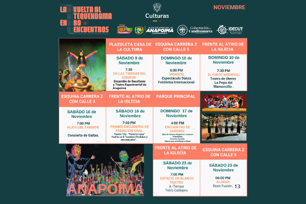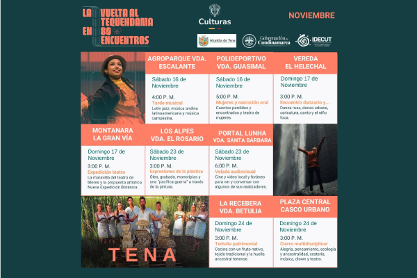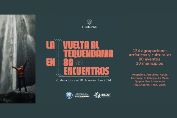 El Ministerio de las Culturas, las Artes y los Saberes, el Instituto Departamental de Cultura y Turismo de Cundinamarca y la Gobernación de Cundinamarca presentan La vuelta al Tequendama en 80 encuentros, un recorrido artístico y cultural que llevará a 124 agrupaciones por 10 municipios de Cundinamarca: Apulo, Anolaima, Anapoima, Cachipay, Quipile, El Colegio, La Mesa, San Antonio del Tequendama, Tena y Viotá.