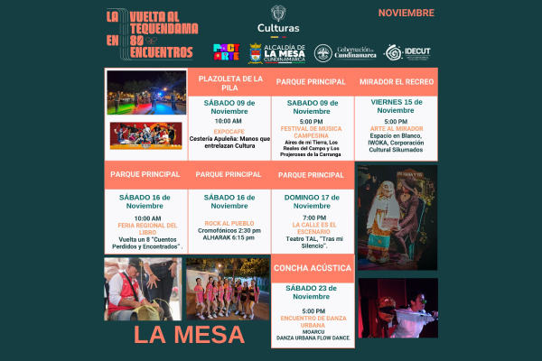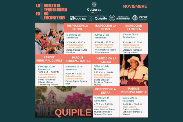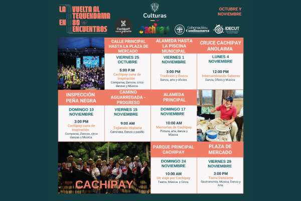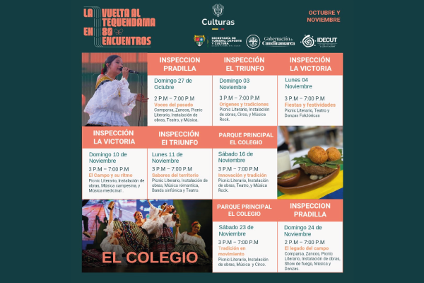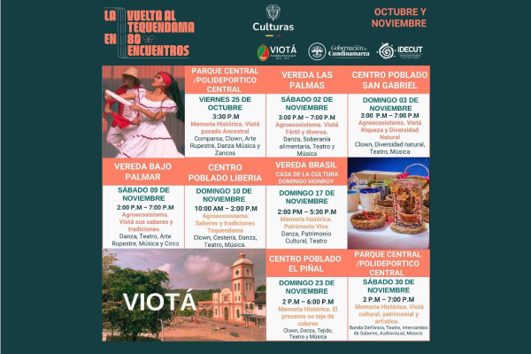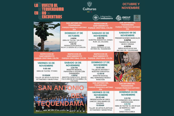 El evento, qué hace parte de los compromisos del Pacto por la Cultura y el Turismo de la provincia del Tequendama, firmado entre el ministerio, el Viceministerio de Turismo, la Unidad Solidaria, la gobernación, el IDECUT, las alcaldías y 58 organizaciones culturales y de turismo de los 10 municipios, se llevará a cabo entre el 25 de octubre y el 30 de noviembre.