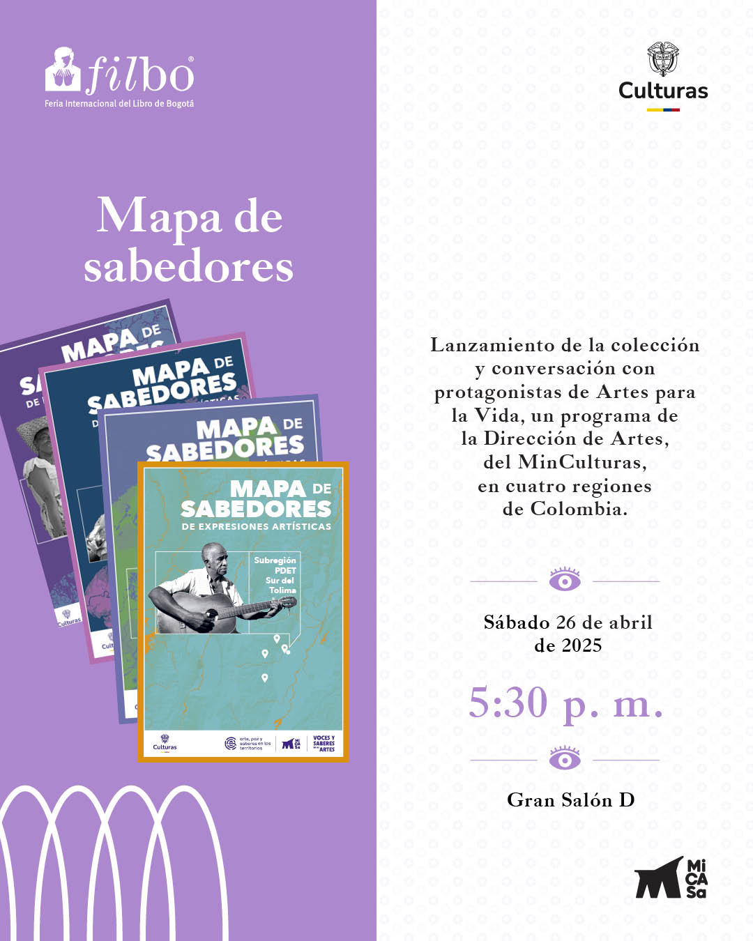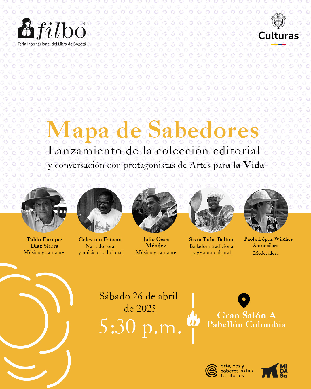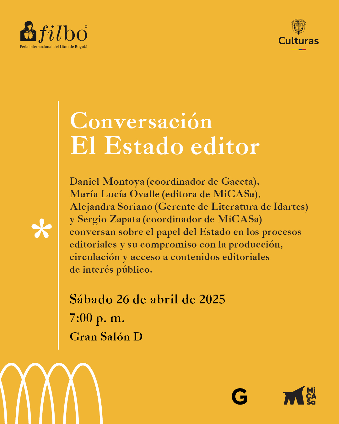 MiCASa estará presente en la FILBo con las presentaciones de los libros ya mencionados, del Mapa de Sabedores, una colección de la Dirección de Artes del Ministerio y el conversatorio “El Estado Editor”, mañana 26 de abril en el Gran Salón D, a las 5:30 p.m. y a las 7:00 p.m., respectivamente.