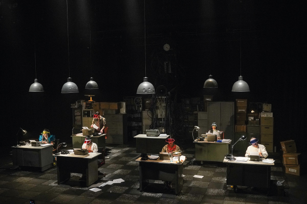 La estética de la obra está inspirada en los ambientes de oficinas burocráticas.